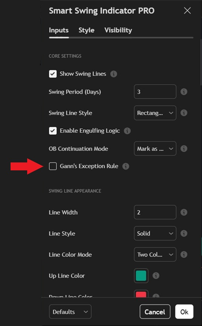 When enabled, Gann's Exception Rule marks a swing when price exceeds a prior extreme, even if the consecutive bar requirement hasn't been fully met.