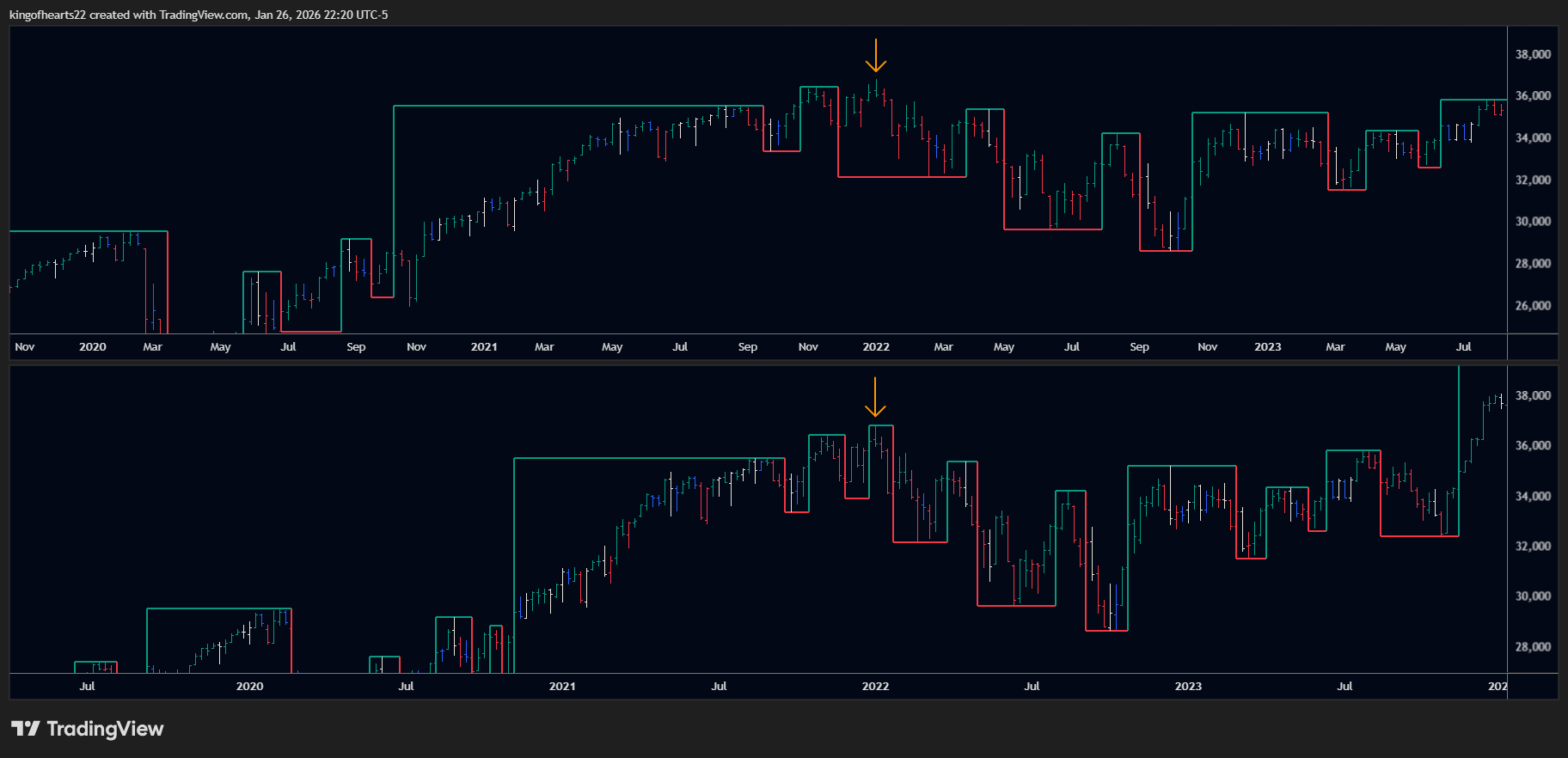 Swing charts follow strict mechanical rules: wait for the required consecutive bars, then mark the reversal. This works beautifully most of the time.