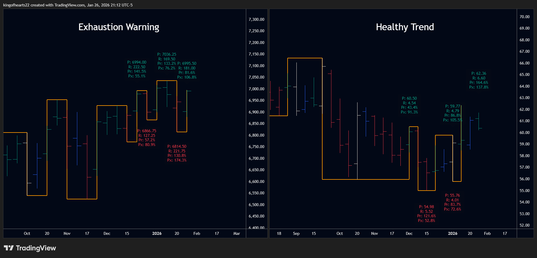 Why it matters: The ultimate momentum indicator. If each leg of an uptrend moves faster than the last (Vel-x > 100%), buyers are increasingly aggressive. Declining velocity extension (Vel-x < 100%) suggests the trend is grinding.