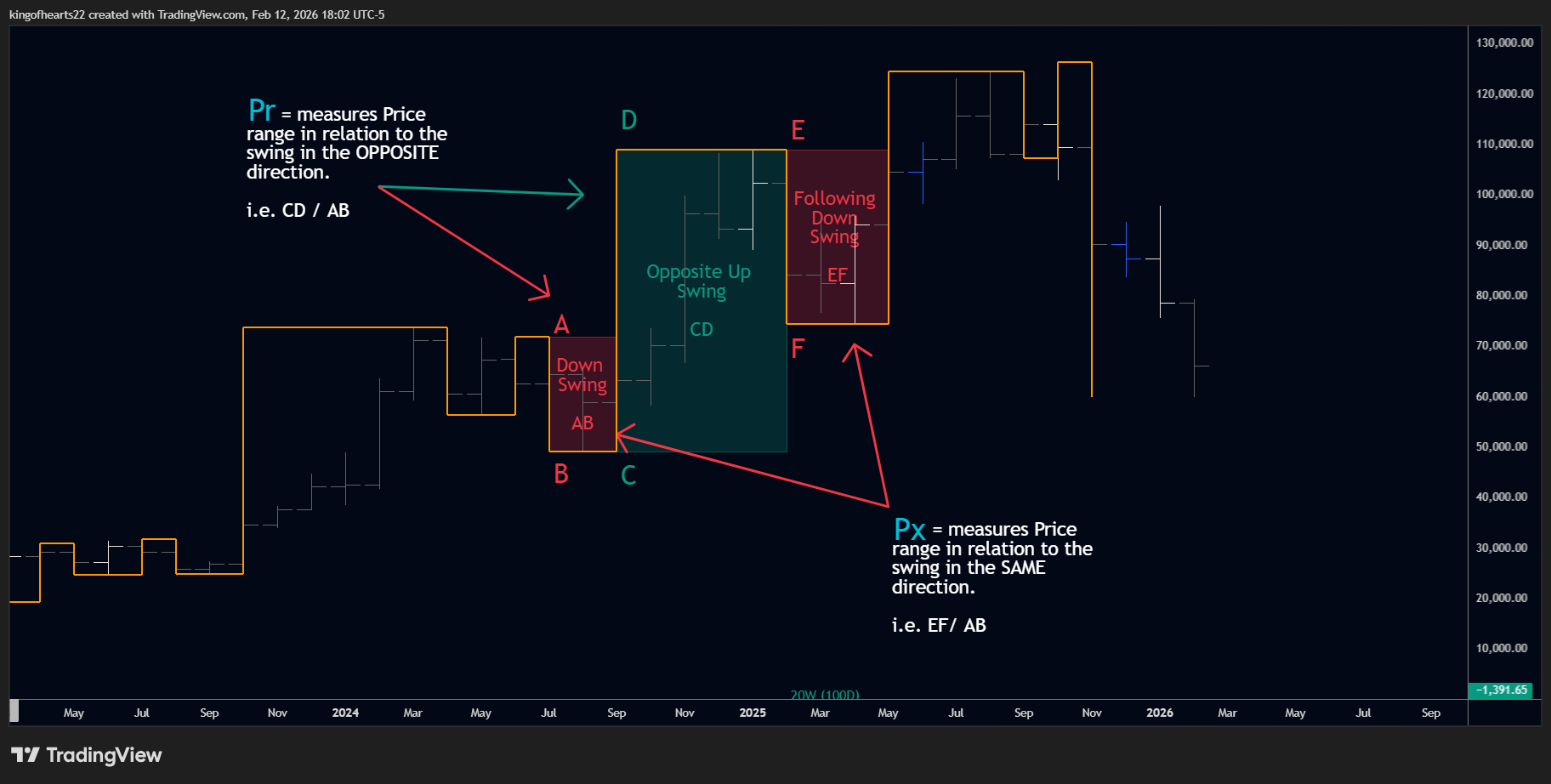 Pr compares to the previous opposite-direction swing. Px compares to the previous same-direction swing.