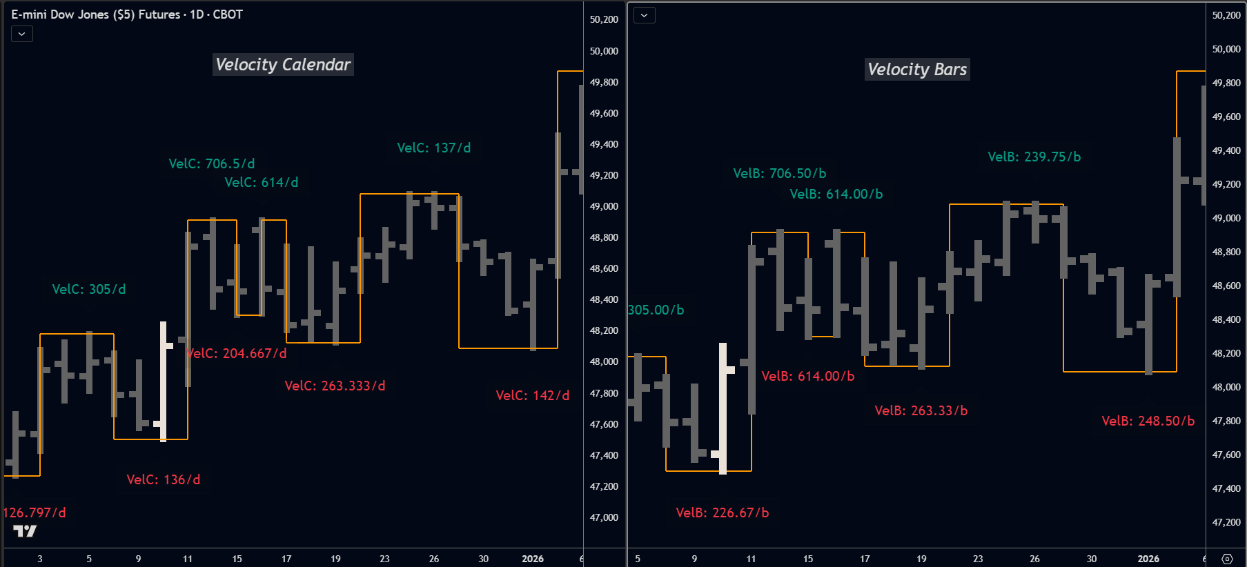 Why both matter: A swing that spans a 3-day weekend shows the same bar count as one during mid-week, but the calendar time differs significantly. VelB tells you chart-based momentum; VelC tells you real-world pace.