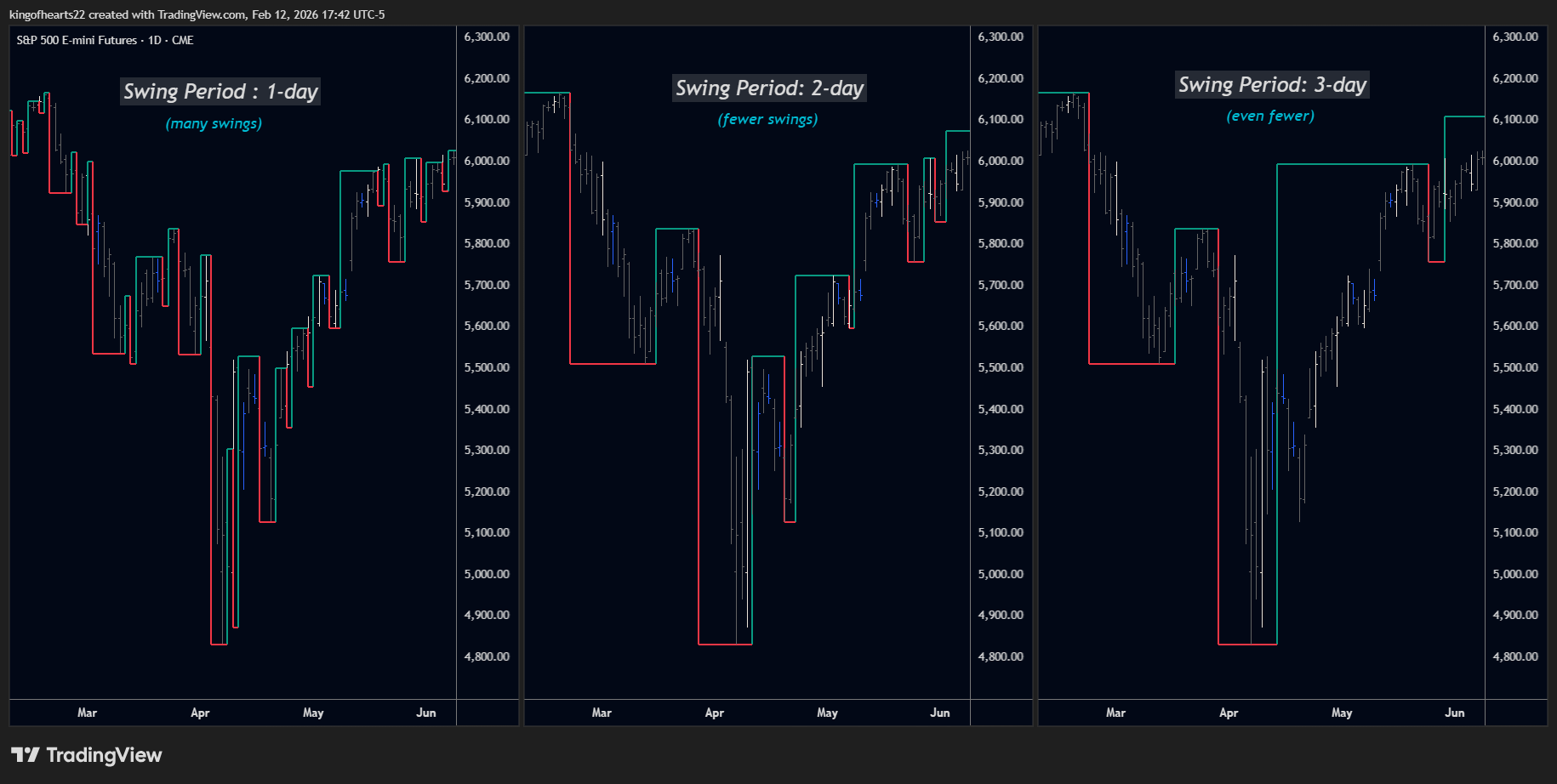 Swing Period 1 vs 2 vs 3. Higher periods filter noise and reveal larger structure.