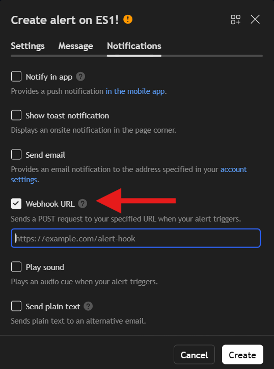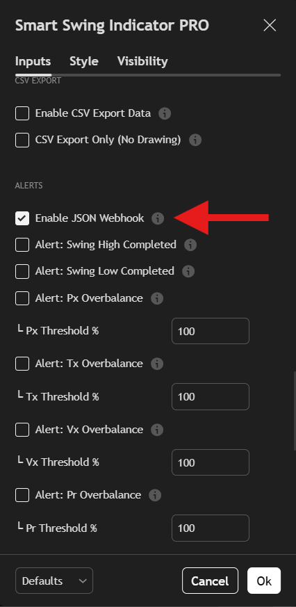 - Enable the setting: Turn on "Enable JSON Webhook" in indicator settings