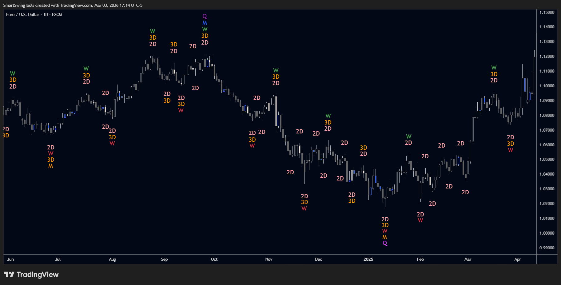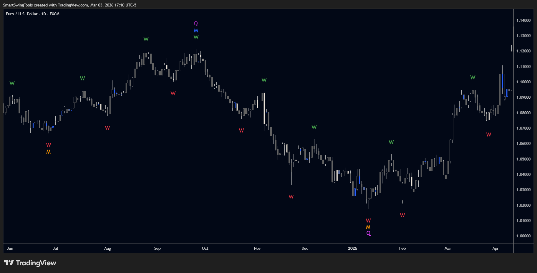 STP solves this by bringing higher timeframe turning points down to your working chart. On a daily chart, you can see exactly where Weekly, Monthly, Quarterly, and Yearly swings occurred — without ever leaving the daily view.
