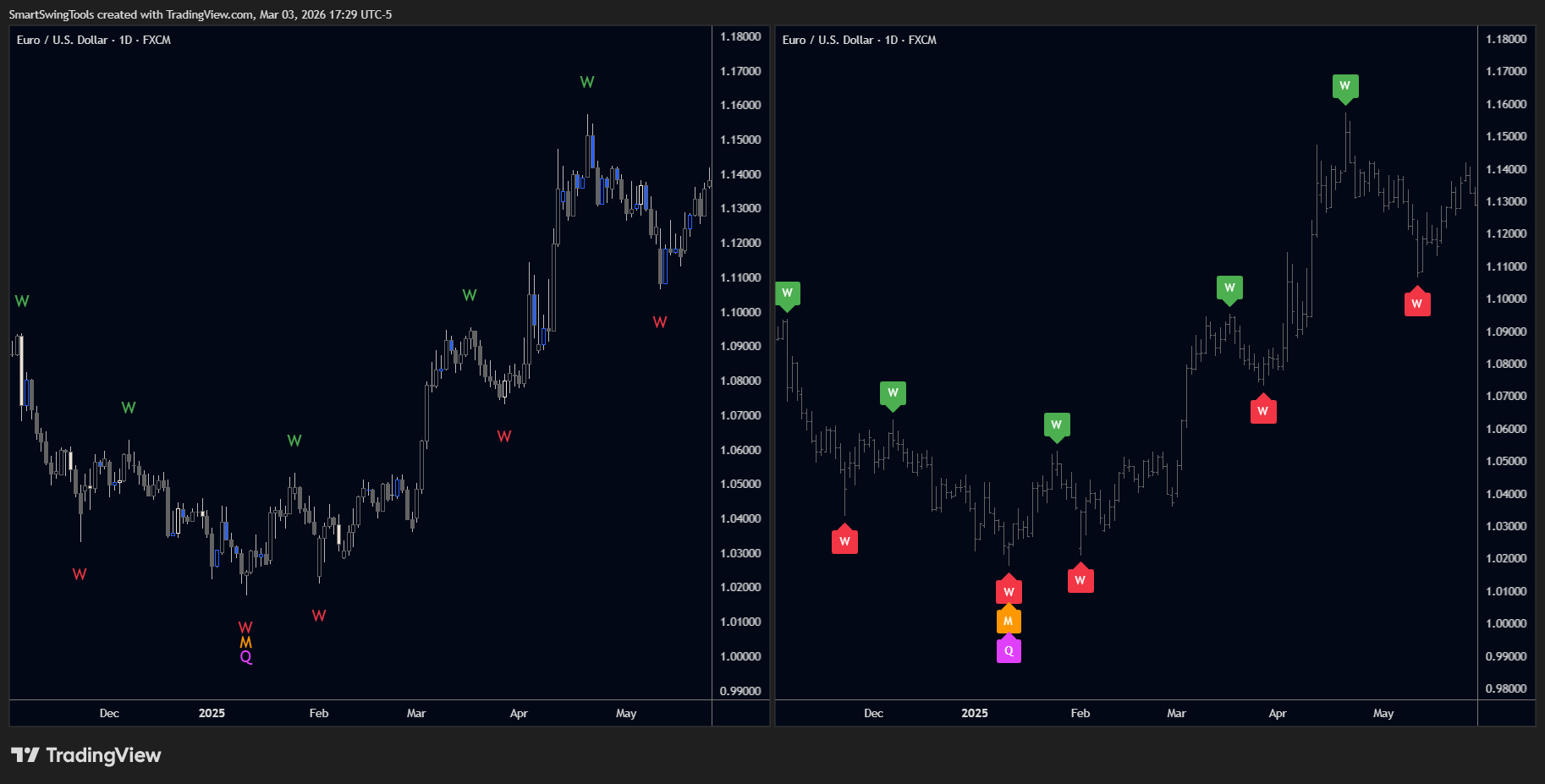 | Visual output | Connected swing lines + metric labels | Timeframe letter labels (no lines) |