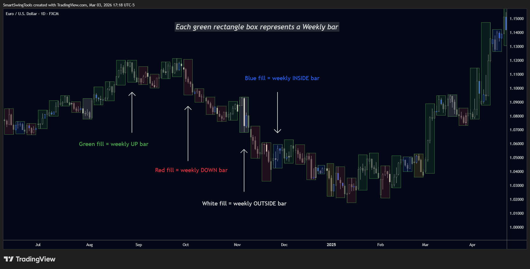 Intelligent Boundary Detection — Period boundaries align to actual exchange times, not arbitrary bar counts. This handles holidays, half-days, and irregular sessions correctly, and ensures the same swing appears at the same bar regardless of when you loaded the chart.
